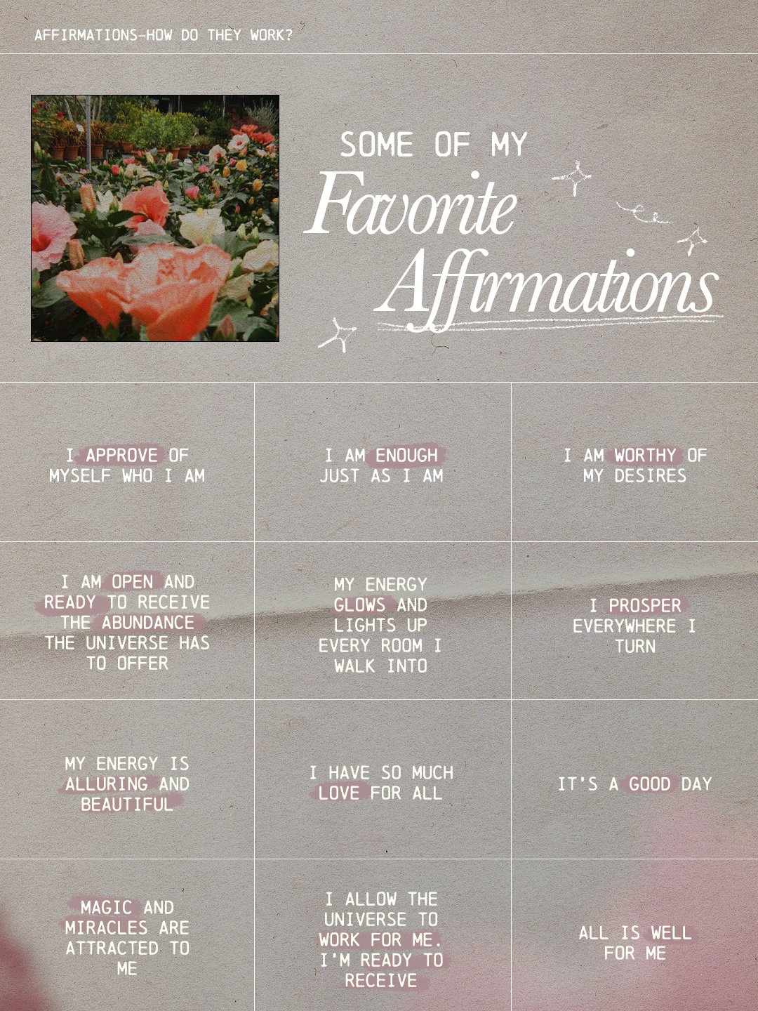 If you are interested, here are some of my favorite affirmations. Some are for wealth, some are for general day-to-day, some are for beauty.